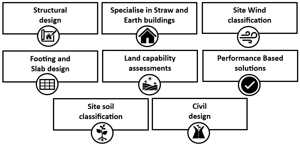 Our business is the accessibility of straw and earth building technologies. Our service is the demonstration of National Construction Code compliance of straw and earth structures through engineering design. Our product is your engineering construction designs and drawings.